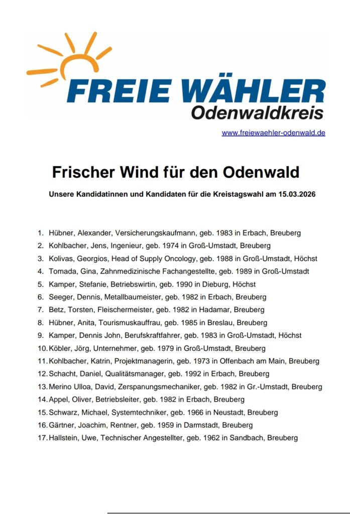 Wir freuen uns, dass Sie den Weg auf unsere Homepage gefunden haben. Wir werden Sie an dieser Stelle regelmäßig über unsere politische Arbeit für den Odenwaldkreis informieren. Lassen Sie uns wissen was Sie bewegt, wo Sie Ansätze für Verbesserungen sehen und was Ihrer Meinung nach das Beste für diesen Kreis ist.